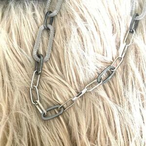 Silver/gray long necklace. Clasp closure. Comes with bag and box. Like new condition