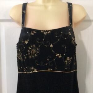 Beautiful special occasion dress in a black velvet with gold embellished bodice and bottom ruffle. Bodice is lined and has bra cups, back bodice is smocked with elastic, back zipper