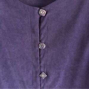 Serving sophisticated funk with a side of throwback flair — this R&K Originals vintage blazer brings all the drama. Rich purple tone with a suede-like texture (hello, cozy poly-blend!) and the true stars of the show: an eclectic mix of artsy buttons. Longline silhouette gives cool coverage for layering or rocking it solo. Feels like 90s art teacher chic meets museum curator with a secret nightlife. 🔮