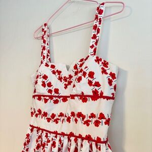 R&K Originals Sleeveless Built-In Bra Padded Fit and Flare Midi Dress in White with Red Poppy Floral Design and Womens US Size 10. Gently used and in excellent condition. Material is 97% Cotton and 3% Spandex.