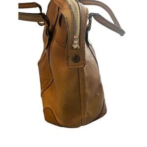 Description: Brown leather travel bag. Great for weekend travel. Lots of room. Inside tag "Made in Japan" Leather has some minor discoloration, bottom has some minor staining but overall the bag is in great shape. Inside the bag is great shape and the bottom structure is in tact. It's a well loved bag with many more miles to go!