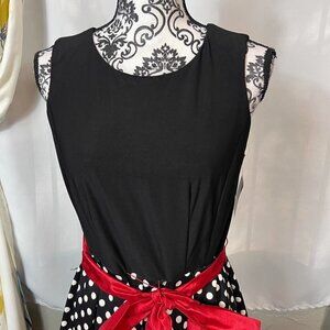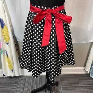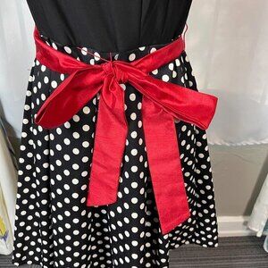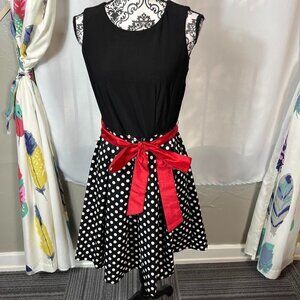 R&K fit n’ flare dress. Black sleeveless bodice with black and white polka dot skirt. Red tie belt. Back zipper closure. Bodice: 95% polyester 5% spandex. Skirt 97% polyester 3% spandex. Slash and lining 100% polyester. Has total pinup, rockabilly, retro vibes. Size 10P