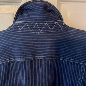 jacket. Looks like a modern French blue Bill Cunningham work shacket. Previous owner overdyed it a mottled blue. I love how the contrast stitching pops!