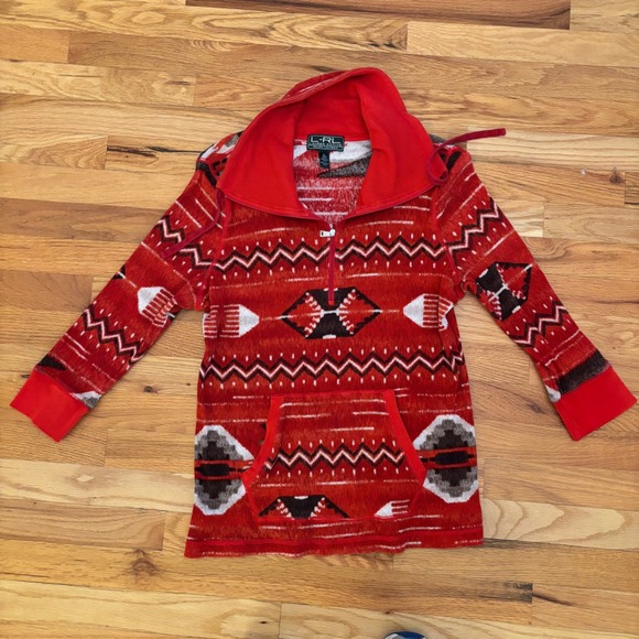 Keywords: Ralph Lauren, Aztec print, Fleece pullover, Geometric pattern, Half zip, Women's sweatshirt, Activewear, Casual top, Cozy, Warm, Winter fashion, Statement piece, Outdoor wear
