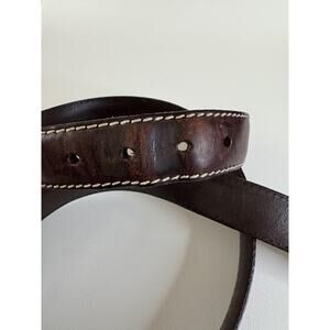 Rich brown genuine leather with off-white topstitching and a sturdy, double-prong vintage style solid brass buckle