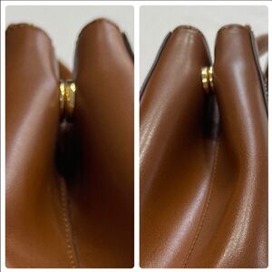 3 separate compartments: 2 of the side compartments close with gold zipper and with gold tone logo pull. Middle compartment closes with a magnetic snap hidden inside a leather (magnet not visible)