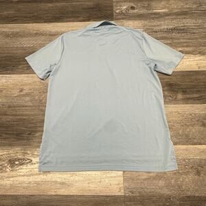 In excellent pre-owned condition, light blue gray white colorway ultra lightweight collared button closure short sleeve high low hem embroidered logo side slit golf athletic sporty.