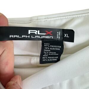 Excellent preowned condition. RLX Ralph Lauren White Athletic Golf Stretchy Pull On Short Skirt. Has white bike shorts under. Has open pockets on front at waist, zippered pocket on back right. Nylon/polyester/elastane material. Approx. measurements: Waist 36", length 19". Size XL.