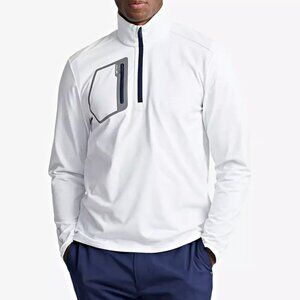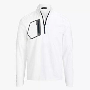 Stylish white long sleeve shirt. Features a zippered chest pocket. Perfect for casual wear.