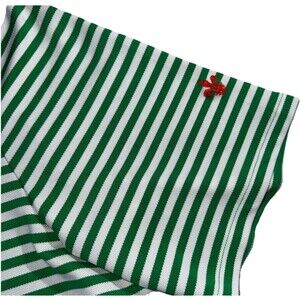 The RLX by Ralph Lauren Golf Polo in men's size medium features a classic green and white striped pattern, short sleeves, a collared neckline with a button closure, and embroidered accents with the brand's logo. Shirt has orange accents around collar on sleeve. This polo shirt is perfect for travel, activewear, and casual occasions, with a medium fabric wash for comfort. Designed for golf performance and everyday style, this polo embodies a mix of preppy and sporty themes, suitable for all seasons.