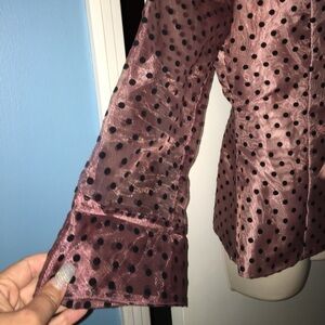 Women's purple with black polka dots stunning jacket It would look good with a black top underneath and some black pants or a black skirt. Please read measurements for sizing. The length is 23 inches and it's 31 inches in the chest laying flat