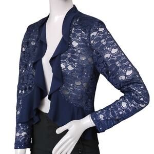 R&M Lace Sequins Open Cardigan Size Small Dark Blue Long Sleeve Ruffle