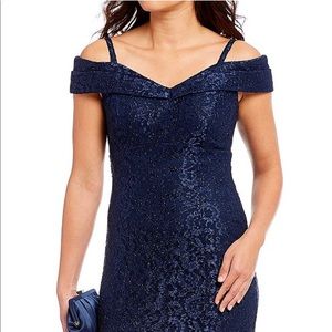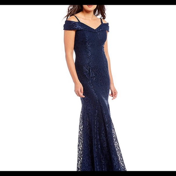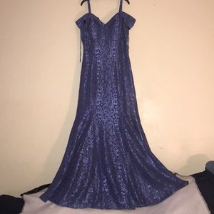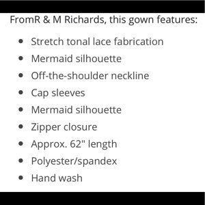 This beautiful mermaid silhouette-dress from R&M Richards is a off the shoulder neck lace gown and is sure to turn heads! The dress is basically brands new was worn once but only for 5 hours. Nothing is missing, torn, or broken on the dress!