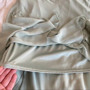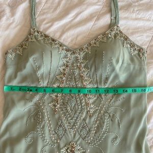 Gorgeous sea foam green gown. Outer layer has a chiffon feel, flowy and feminine with stunning beading. Inner layer is stretchy and soft. Adjustable beaded straps. Sz 12. This is perfect for a night out or a more formal gala or wedding. I am 5’8” and lining falls just above my knee with the outer layer falling delicately below my knee. I measure (loosely) 40” at the bust and 34” at the smallest part of my waist and this dress is a tad loose on me. 100% Polyester. Dry clean only. EUC!