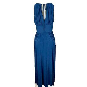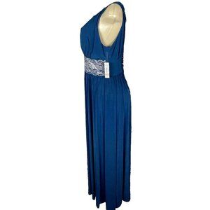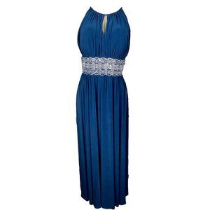 R&M Richards 12 Blue Peacock Beaded Waist Keyhole Halter Neck Open Tie Back Gown