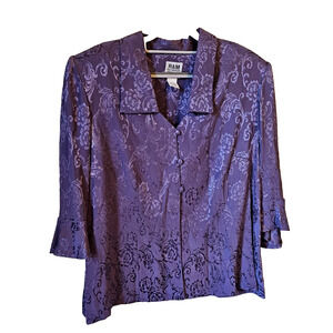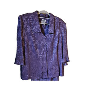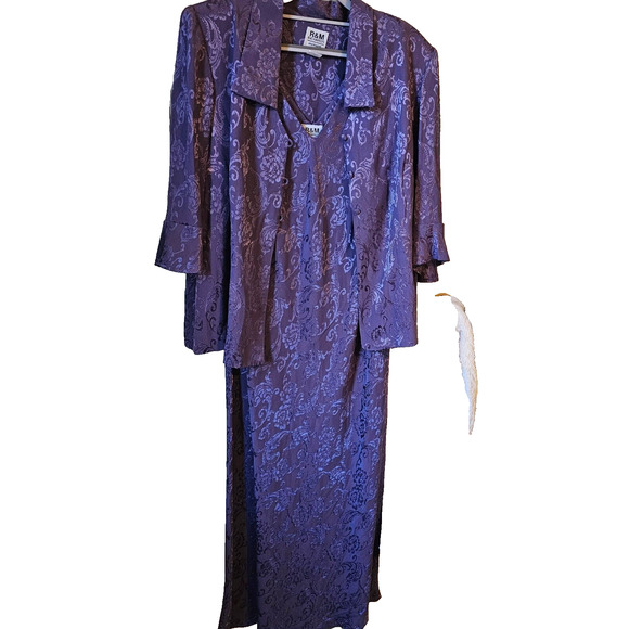 Elegant R&M Richards vintage 2-piece evening set featuring a sleeveless embossed jacquard long dress with a matching jacket. Beautiful purple tone with a textured floral pattern and a flattering silhouette. Perfect for formal events, holiday parties, banquets, or Mother of the Bride/Groom wear.