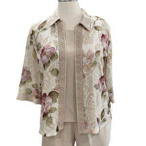This elegant 3-piece set by R&M Richards is the perfect blend of comfort and classic style. It includes a soft sleeveless shell, elastic-waist pants, and a beautifully textured sheer floral jacket with crochet trim. Designed in neutral tones with rose and green floral accents, this set is timeless, flattering, and easy to wear for any occasion.