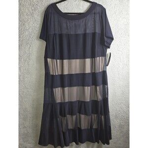 R&M Richards A-Line Dress Womens 22W Navy Blue Mesh Sheer Stripe SS Lagenlook