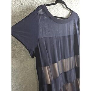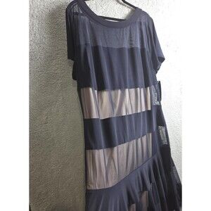 R&M Richards Shift Dress Womens 22W Navy Blue Taupe Lined Mesh Sheer Stripe Short Sleeve Dark Moody Lagenlook Stretchy Comfy Chic