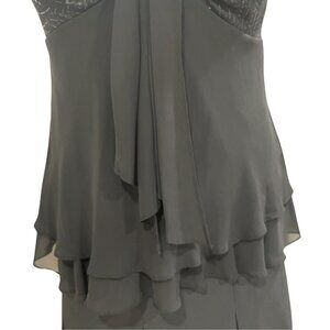 Elevate your evening style with this stunning RM Richards black chiffon tunic. Designed in a flattering plus size 14W, this elegant top features layered chiffon ruffles, a sparkling beaded accent at the bust, and short flutter sleeves. The subtle metallic abstract pattern on the bodice adds a touch of glam, making it perfect for special occasions, weddings, or formal events. Crafted in the USA, this top combines timeless sophistication with quality craftsmanship.