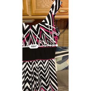 This stylish R&M Richards set includes a sleeveless dress and a matching jacket. The dress features a black and white geometric print with a flattering silhouette. The pink jacket adds a pop of color and can be worn with the dress or separately. Perfect for a special occasion or a night out.