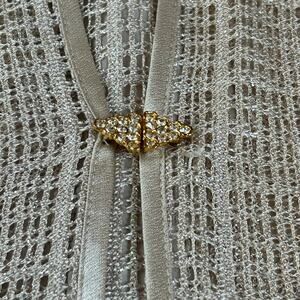 Details: - 3/4 Sleeve Mock Tee and Jacket Top - The Pictures don't show the full shimmer but it has metallic threads throughout- Bling Hook and Eye Closure - Satin Trim on Collar and Cuffs -
