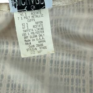 Materials: Body: 93% Acetate; 7% Poly Metallic | Cuffs: 53% Rayon; 47% Acetate | Taffeta Lining