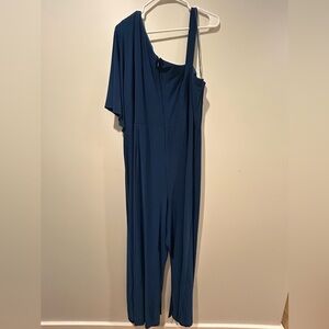 A classic jumpsuit with a stunning twist - this outfit gives a new fashionable look to the classic jumpsuit. With wide legs and a fitted waist create curves and shape, while an overlay provides movement and layering. One thin strap shows of the shoulder, while the other is shrouded in a draped sleeve giving a stunning neckline and skin to show. You can dress this up and be the talk of any event you go to.