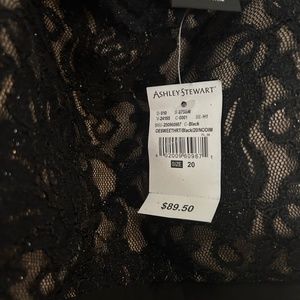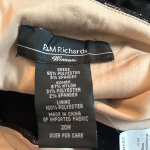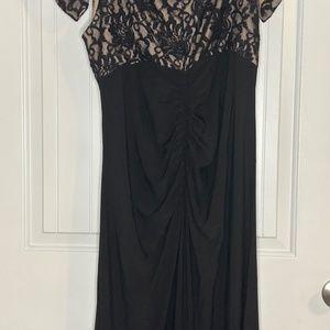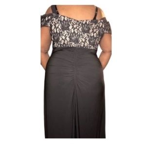 Black R&M Richards gown has beautiful sparkle lace top with ruching on the left side and back of dress. Lined top.