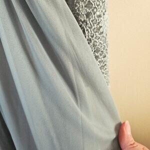 Beautiful sage green full length dress from R&M Richards, size 8. Lace top is embellished with sequins for a little sparkle and it has a flowy skirt. Very flattering and perfect for the mother of the bride or a special event.