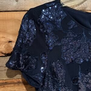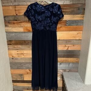 R&M Richards Mesh Sequin Embellished Short Sleeve Maxi Evening Dress Navy Size 6