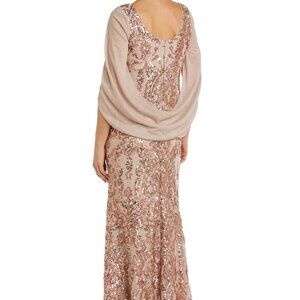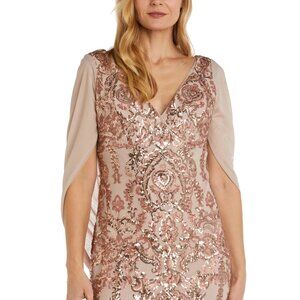 R&M Richards NWT Sequin Gown with Chiffon Wrap Around Cape Rose Gold Size 18