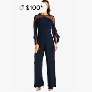 R&M Richards NWT Wide Leg Jumpsuit Ruffle Illusion Mesh Navy Plus Size Petite