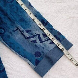 This two-piece set offers a refined look with a flowing blue dress and matching abstract-patterned jacket. Ideal for formal or professional settings. • Size 16WP (Women's Petite) • 100% Polyester material • Machine washable, gentle cycle • Decorative lace trim on jacket • Abstract print pattern in vibrant blue tones Jacket top to bottom = 27 inches