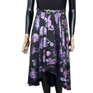 R&M Richards petite 4P black floral purple dress belted fit and flare midi evening cocktail wedding guest winter dress formal semi formal holiday party dress Christmas New Year’s Eve NYE elegant