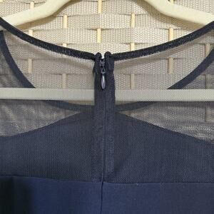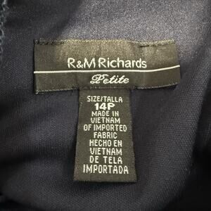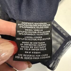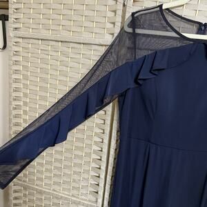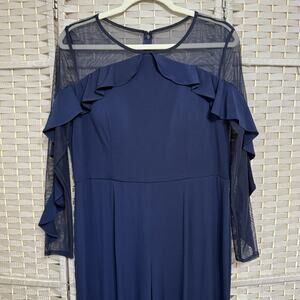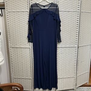 R&M Richards Ruffled Illusion Formal Jumpsuit Size 14P Petite Navy Mesh Sleeve