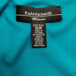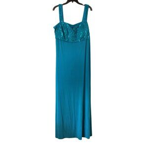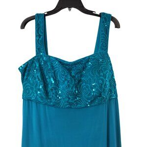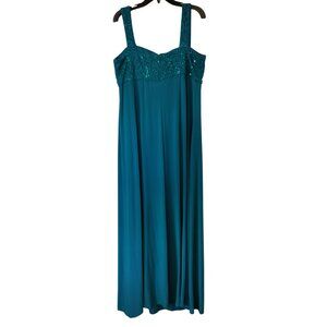 The R+M Richards Sequin Lace Dress in Size 16W with Matching Bolero Jacket is a stunning party or cocktail outfit for plus-size women. The dress features a sweetheart neckline, sleeveless design, and long length, all accented with sequin detailing for an elegant touch. Made of nylon lace fabric in a solid teal color, this dress exudes a sophisticated and stylish look perfect for summer, fall, or spring events. The matching jacket adds a touch of versatility to the ensemble, making it a chic addition to any wardrobe.