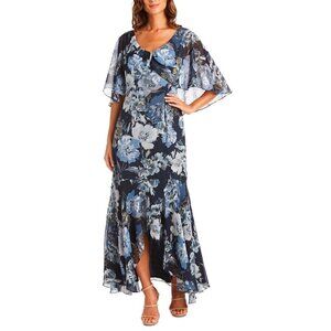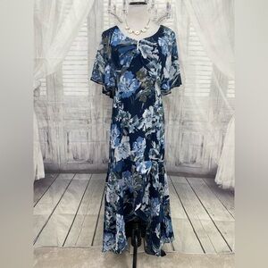 R&M Richards Size 8P 8 Navy Blue Floral High Low Chiffon Dress Evening Formal