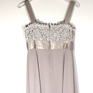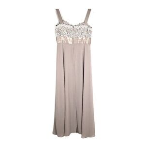 Beautiful classic tan colored R&M Richards dress for sale. Size 6. Super long, perfect for wedding/formals or proms. Excellent Pre-owned, like new. No visible flaws