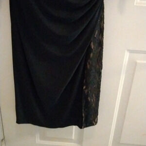 This is a very forgiving dress with cinched waist and stretchy material. Partial lacy sparkly front, back and bottom with a little slit. V neck, underlining, and 3/4 sleeve makes this the perfect dress year round.