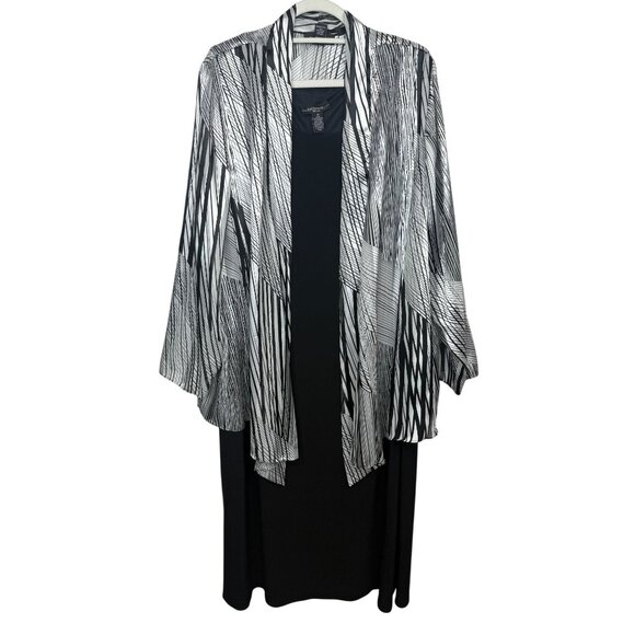 Elegant and flattering two-piece formal set by R&M Richards Woman, featuring a sleeveless black maxi dress paired with a lightweight open-front jacket in a black and white metallic abstract print. The dress is stretchy, comfortable, and perfect for evening events, celebrations, church, banquets, or holiday gatherings. The jacket adds movement, shimmer, and coverage without feeling heavy. Size 2X. Gently preowned with normal light wear — overall great presentation. Please see photos for full details and measurements.