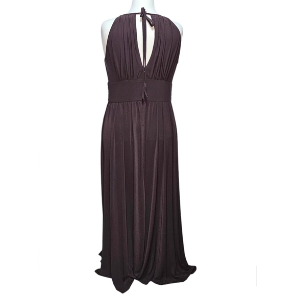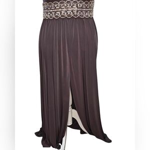 Beautiful Maxi dress with sequins and glass bead waist. Built in cups, back zip with tie at neck. Extremely flattering for plus size, front slit to above knee. There doesn't appear to be any missing beads, but there are loose threads around the sides. Deep plum color. Bought at Macy's and only worn once.