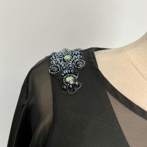 - Attached sheer chiffon overlay with beaded detail at shoulders