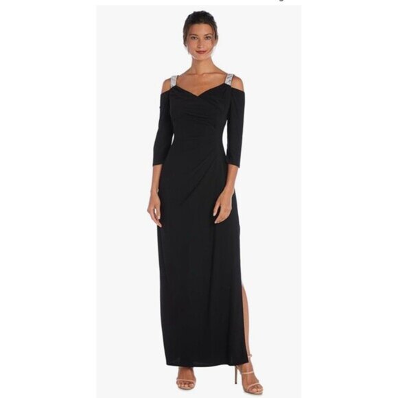 This stunning black evening dress by R&M Richards is the perfect choice for any glamorous occasion. The dress features intricate rhinestone accents that adds a touch of sophistication to your look. The 3/4 cold shoulder sleeves and stretch fabric provide a comfortable fit, while the zip closure ensures easy wear.