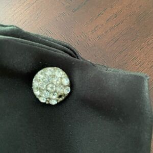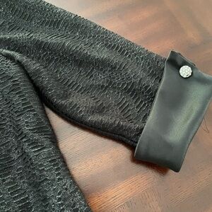 R&M Richards women’s two piece black metallic lace/ Satin evening jacket. Callared 3/4 cuffed w/ satin Rhinestone button . One stone is missing . Pit to pit 21.5” length 22” . Body is lined. Made of polyester and spandex. Great for any formal occasion. Pre owned very good condition