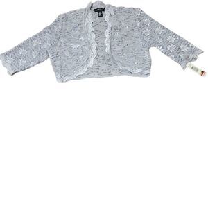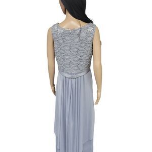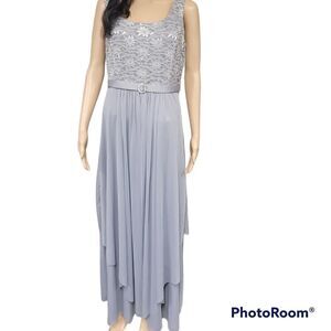 Platinum gown with a lace and Sequin top and sweater. Multiple layer skirt and rhinestone belt. Size 8.