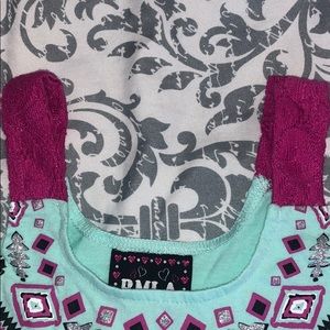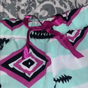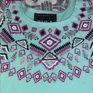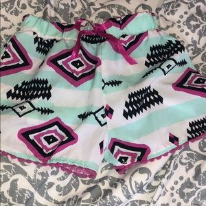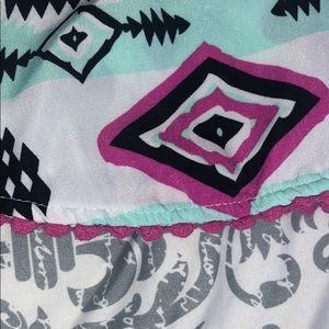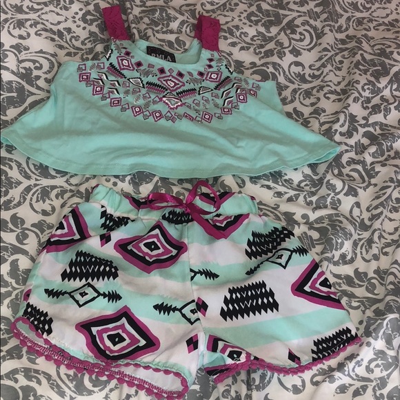 Both pieces are a size 6. Top is loose, flowy cotton with an Aztec screen print with glitter. Shorts have same Aztec print, but are a cool flowy material. Satin bow detail at elastic waist and embroidered detail at hem. Does require a white tank to be worn underneath.