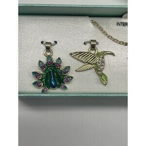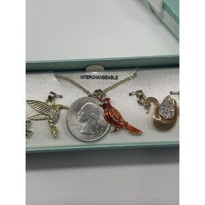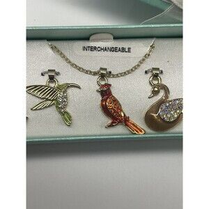 This adorable unique necklace is perfect for the bird lover. With five bird charms you can switch out and have a different look daily. Comes with a peacock charm, hummingbird charm, red cardinal charm, swan charm and flamingo charm. All five charms are embellished with beautiful shiny rhinestones. 18 with a 3 extender. New in hard gift box. Comes from a smoke free home.