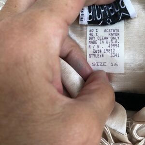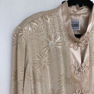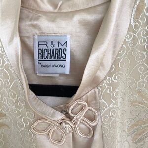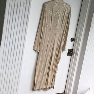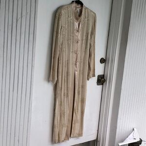 This is a beautiful evening duster made for Richard’s by Karen Wang. It’s a beautiful vintage piece. As for slits two on the side lawn front and back. It’s an ivory color that throws a little more to gold. Measuring across the shoulders soon to see is 17 inches, picked to pit is 21 inches, from the top of the shoulder to the bottom is 50 inches. Measurements are approximate