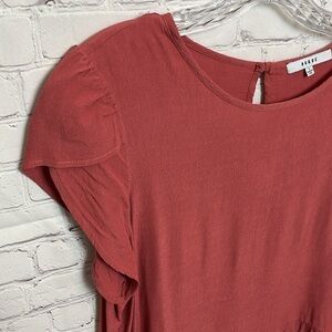 Solid salmon red short sleeved blouse. Tiered bottom. Tulip sleeves. Tear drop opening at back with loop and button closure. Flowy silhouette. 100% Rayon.